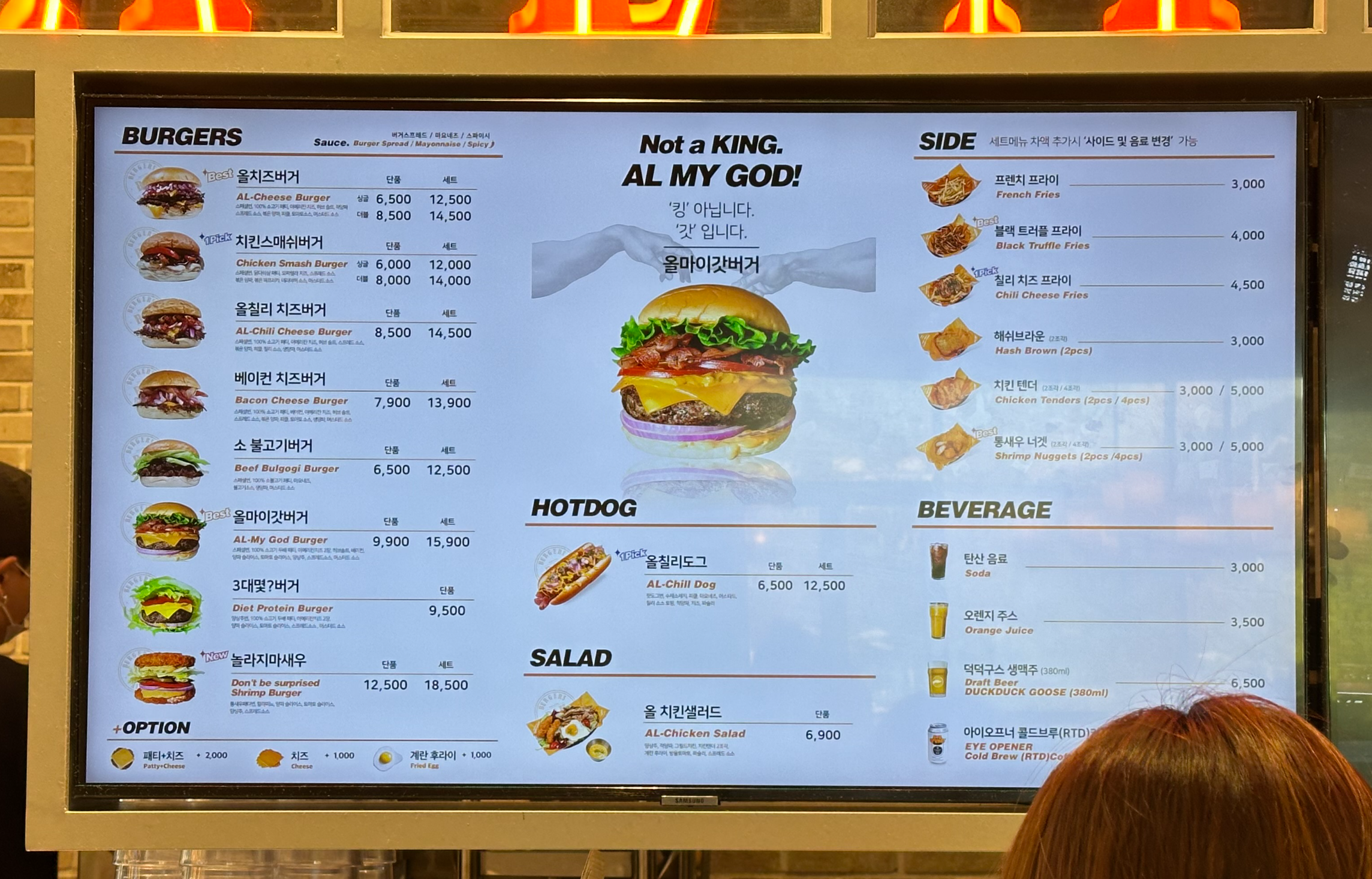 특이한 게, 올치즈버거는 패트를 3개나 올릴 수 있는 메뉴이더군요.